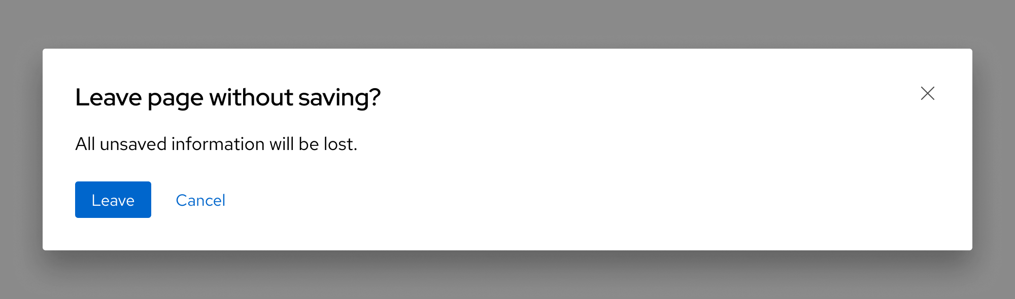 A dialog container with a black headline, black body text, two blue buttons, and a dark gray close button all on a white background on top of a slightly transparent black background
